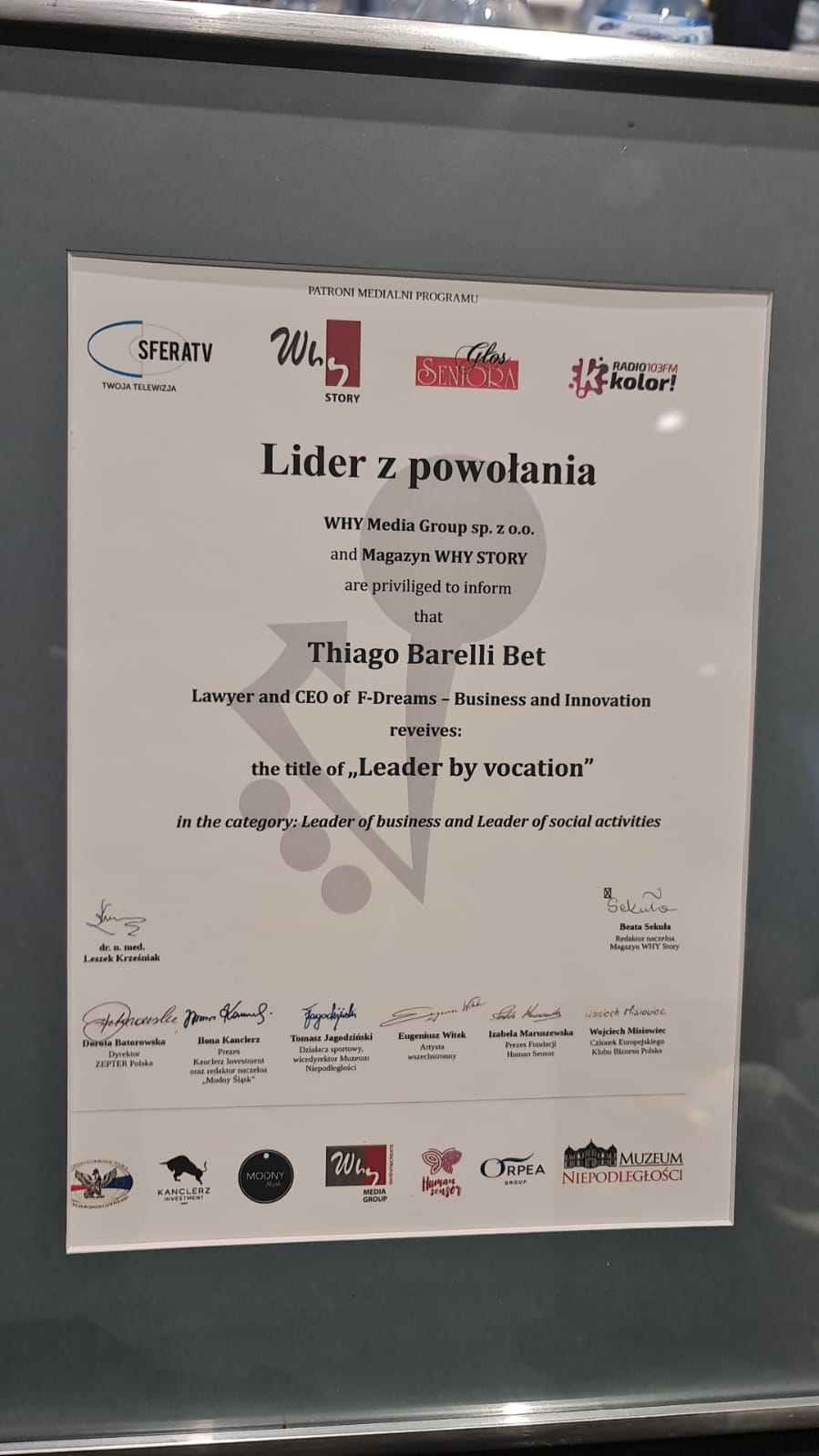 “Tive a honra de ser laureado com o título de Líder por Vocação, da Revista @whystory.pl apoiado pela @ONU, título este concedido em virtude da nossa atuação no Brasil e na Europa, no apoio ao empreendedorismo, a inovação e as organizações sociais. A indicação em 3 categorias já havia me deixado muito grato e ter sido laureado em 2 delas (business e social activities) com certeza é motivo de orgulho e demonstra, acima de tudo, que estamos no caminho certo.”