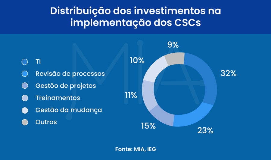 De acordo com a MIA (Market Intelligence Application Shared Services), plataforma de dados do IEG que reúne informações sobre CSC de mais de 200 empresas, os custos com tecnologia representam 32% dos investimentos realizados nos projetos de implementação de um Centro de Serviços Compartilhados.