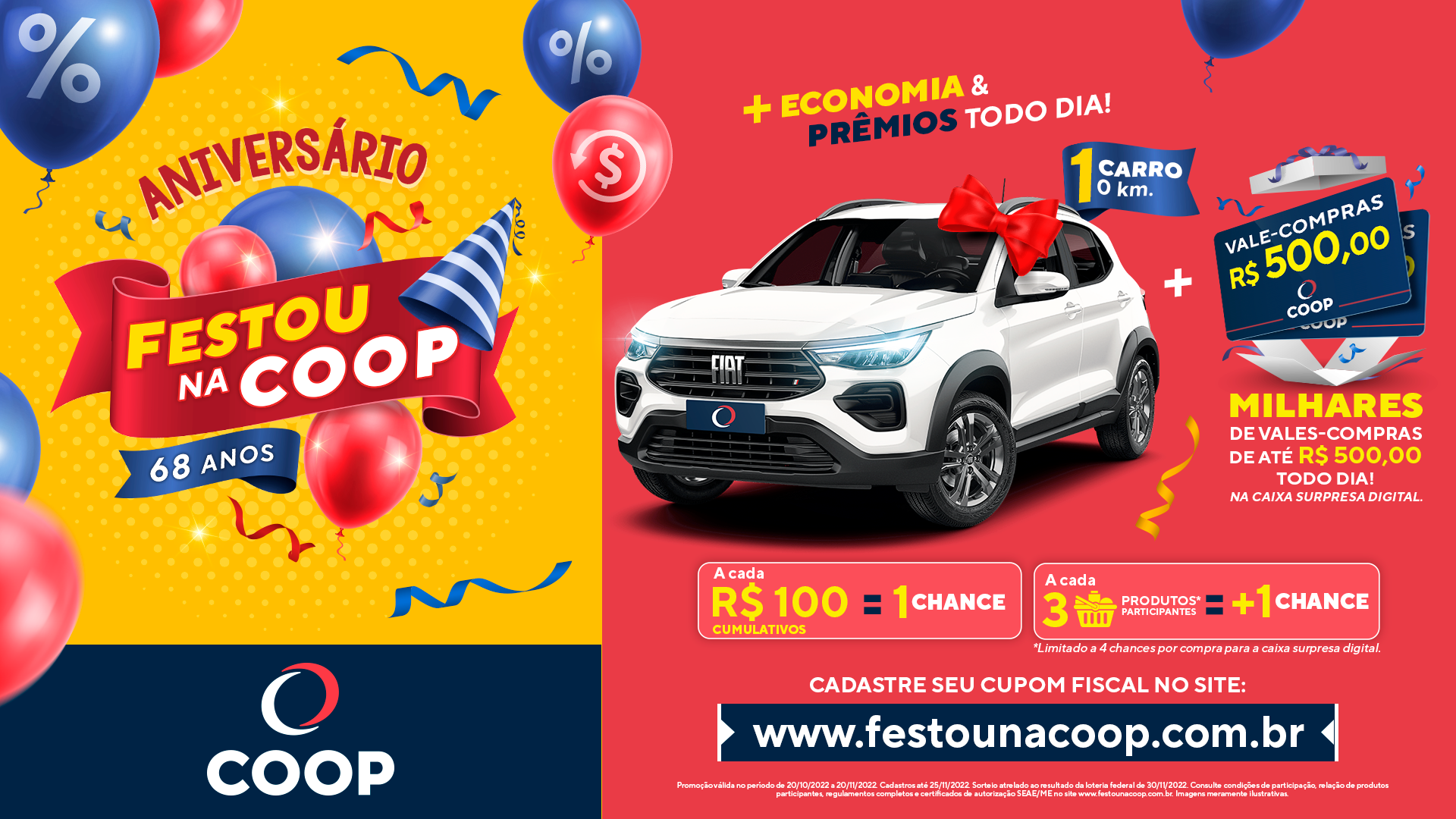 Para comemorar o aniversário de 68 anos de fundação, a Coop realizará entre os dias 20 de outubro e 20 de novembro, a campanha Festou na Coop, com sorteio diário de vales-compra de até R$ 500 em todas as lojas e o sorteio de um automóvel Fiat Pulse, no valor de R$ 95 mil, no dia 30 de novembro.