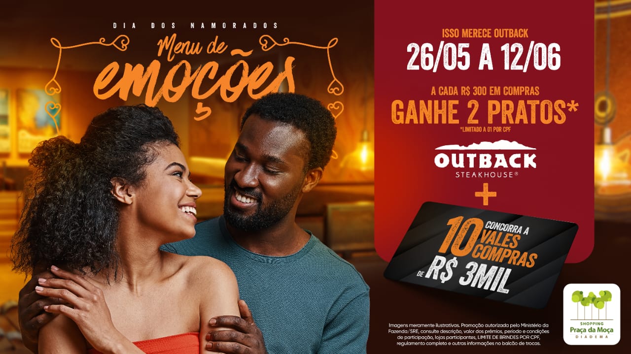 O Shopping Praça da Moça, em Diadema, realizará até 12 de junho, a Campanha de Dia dos Namorados. A cada R$ 300 em compras nas lojas do empreendimento, os clientes ganharão um voucher com direito a dois pratos do Outback, além de concorrerem a dez vales-compras de R$ 3 mil. Para participar da campanha, basta cadastrar as notas fiscais das compras no balcão de autoatendimento do mall.