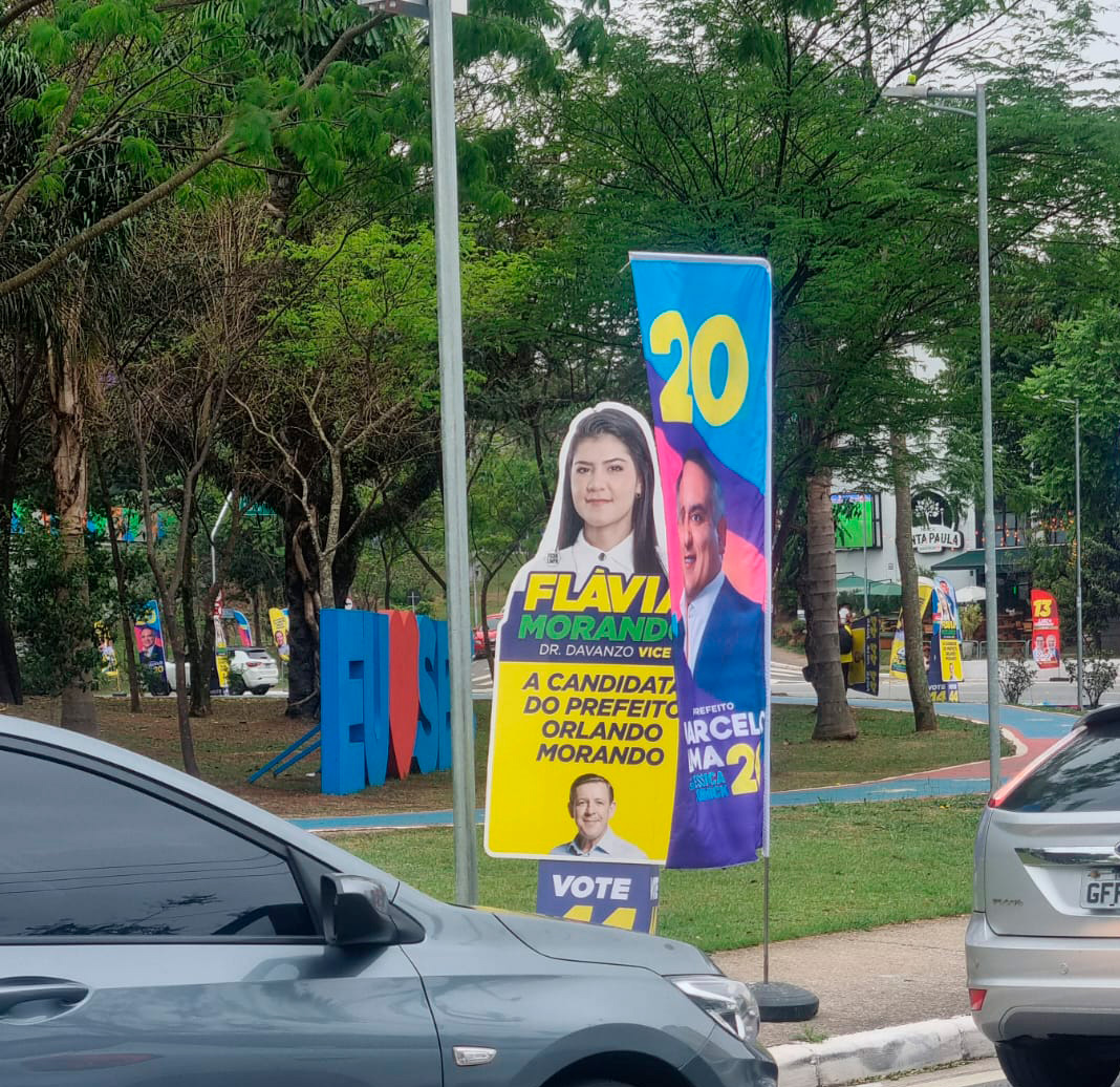 A candidata de São Bernardo e sobrinha do atual prefeito, Flavia Morando, divulgou um vídeo nos últimos dias criticando o uso exagerado dos wind banners, as peças publicitárias queridinhas das campanhas deste ano. No vídeo das redes sociais, a candidata diz que cada um chega a custar R$ 150 e que os concorrentes colocam uma quantidade muito grande das ruas, gastando bastante dinheiro. .