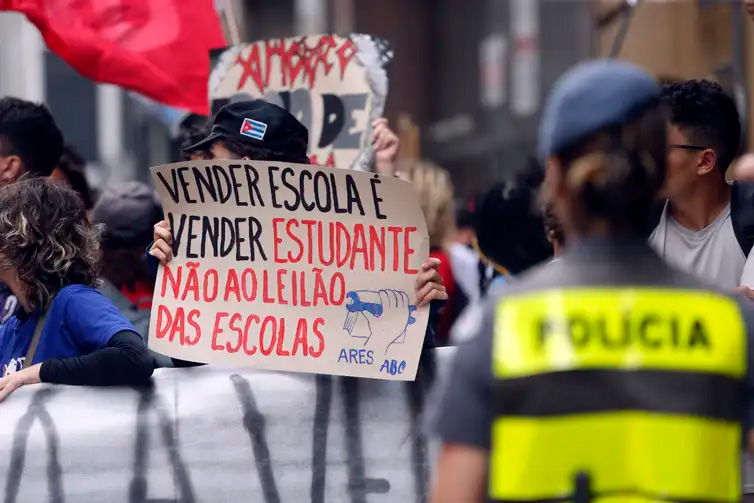 Enquanto o leilão ocorria na sede da B3, alunos da rede estadual se manifestaram contra a privatização. Para conter o avanço dos estudantes, o governador Tarcísio de Freitas, colocou a Força Tática em ação. Com gás lacrimogêneo e golpes de cassetetes, cerca de 200 estudantes e professores foram afastados do local.