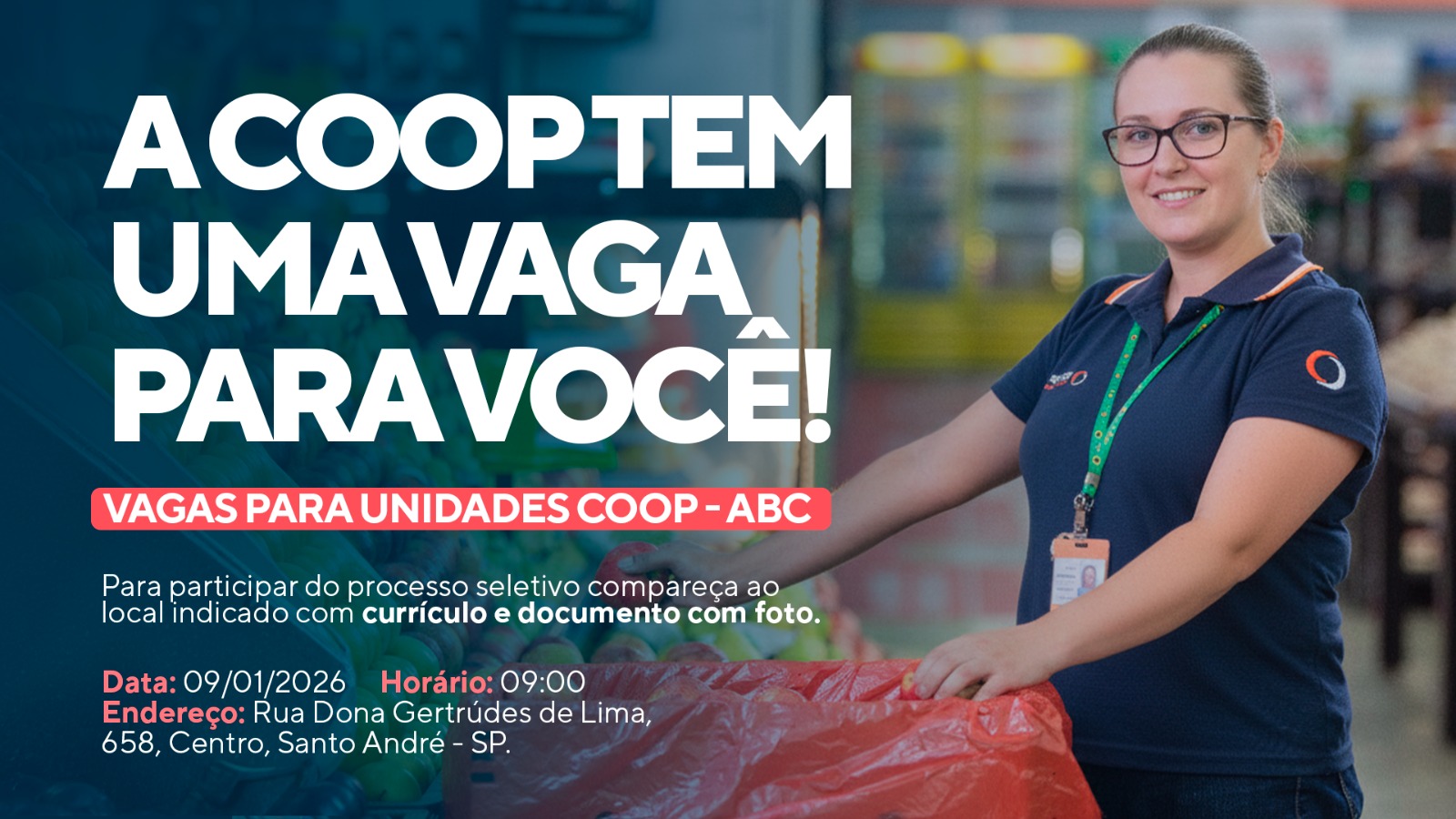 A ação acontecerá na unidade localizada na Rua Dona Gertrudes de Lima, 658, no Centro de Santo André, e contempla vagas em todos os setores da rede. Existem oportunidades também nas outras regiões onde a Coop mantém operações, como São José dos Campos, Sorocaba, Tatuí e Piracicaba.