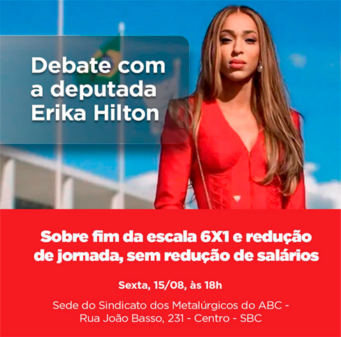 O Sindicato dos Metalúrgicos do ABC recebe, nesta sexta-feira, 15 de agosto, às 18h, um debate aberto com a deputada federal Erika Hilton (PSOL-SP) sobre temas centrais para a classe trabalhadora: o fim da escala 6×1 e a redução da jornada de trabalho sem redução de salários.