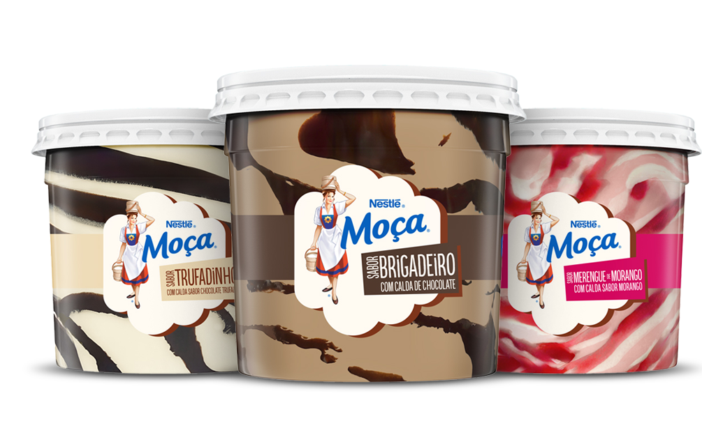 Moça é uma marca histórica, reconhecida por 98% dos brasileiros e lembrada por sua qualidade e tradição há mais de 100 anos. É justamente essa combinação de tradição e inovação que ganha forma em três novos sabores: Moça® Brigadeiro com calda de chocolate; Moça® Merengue de morango com calda sabor morango e Moça® Trufadinho com calda sabor chocolate trufado.
