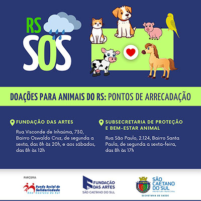 A Fundação das Artes de São Caetano e a Subsecretaria de Proteção e Bem-Estar Animal de São Caetano se junta, à mobilização para ajudar o Rio Grande do Sul, atingido pelas fortes chuvas que deixaram mortos, desaparecidos e milhares de desalojados. Os locais agora são pontos de coleta exclusivo para doações destinadas aos animais resgatados nas enchentes. A ação conta com parceria do Fundo Social de Solidariedade de São Caetano.