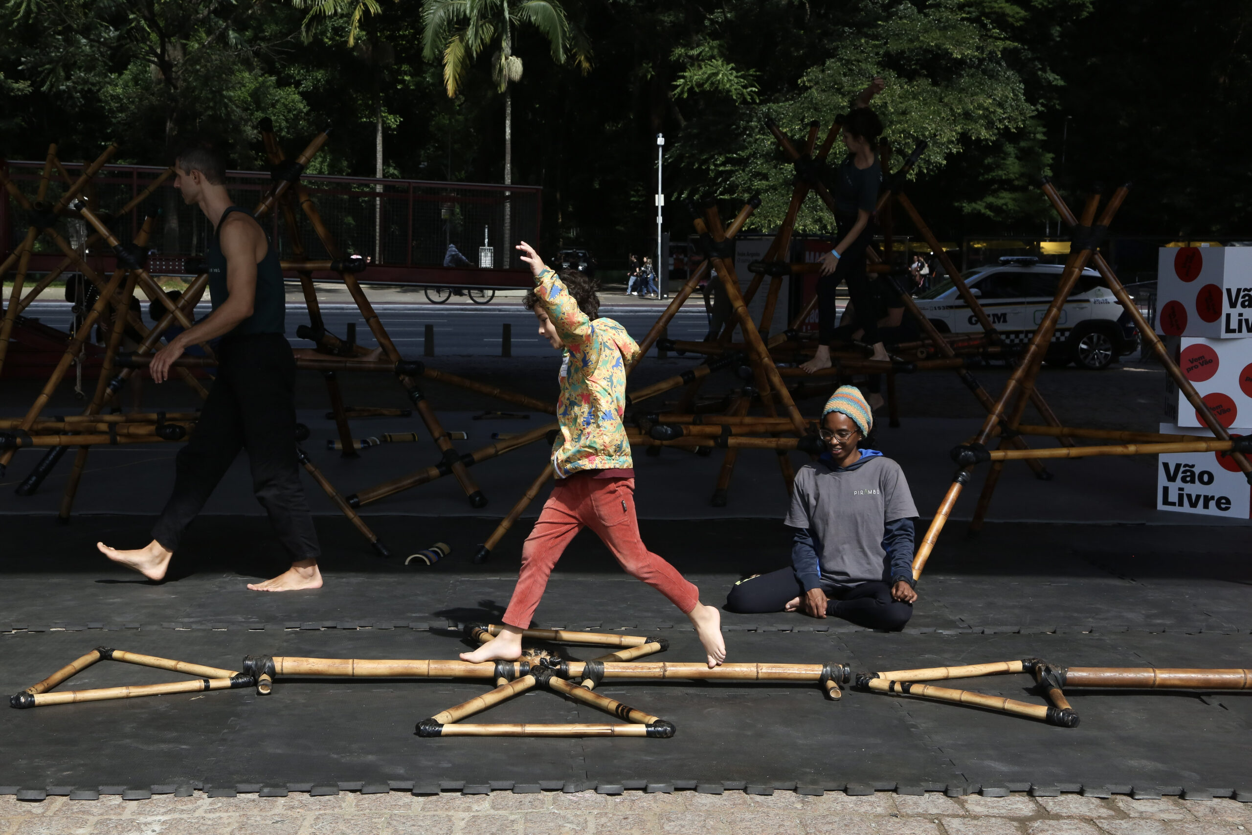 Pirambô é um convite para a movimentação espontânea e lúdica através de estruturas de bambu que compõem um espaço de experimentações e interações a partir de uma metodologia aliada ao conceito de fluxo e elementos de circo, parkour, yoga, teatro e jogos tradicionais.