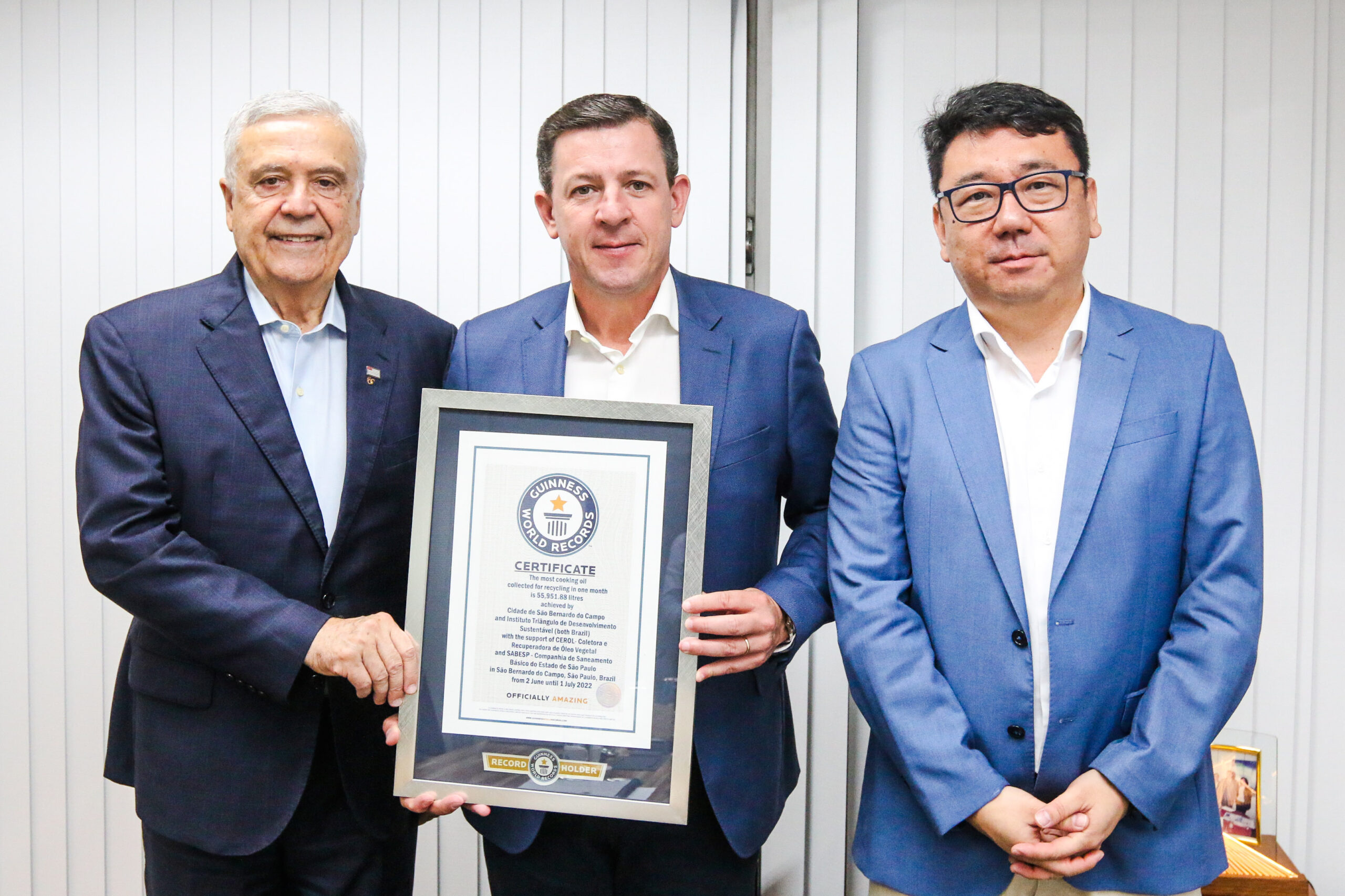 Além da apresentação de detalhes do projeto da usina, o prefeito entregou, nas mãos de Benedito Braga, certificado do Guiness World Records pela colaboração da empresa na mobilização do Programa Eco Óleo de São Bernardo. O reconhecimento se deu, pela segunda vez, após o município arrecadar 55.951 litros do resíduo no período de um mês. A certificação aconteceu no mês passado em Nova Iorque (EUA), no escritório mundial da entidade.